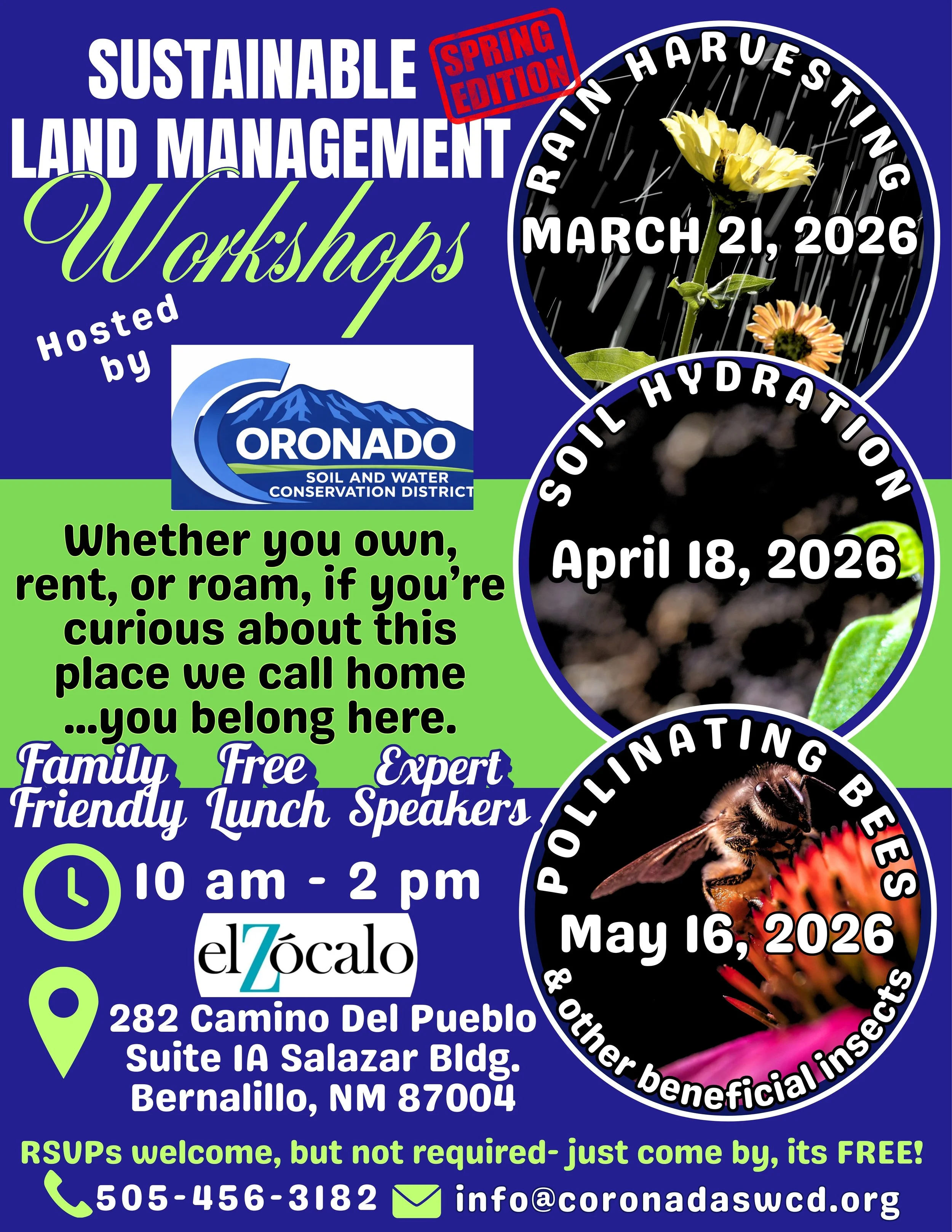 Whether you own, rent, or roam, if you’re curious about this place we call home… you belong here. Join us for three workshops, Rain Harvesting, Soil Hydration, and Pollinating Bees (and other beneficial insects) throughout this spring. Free lunch is provided, the event is family friendly and features expert speakers and a chance to win a free rain barrel. Reservations are appreciated but required, hope to see you there.