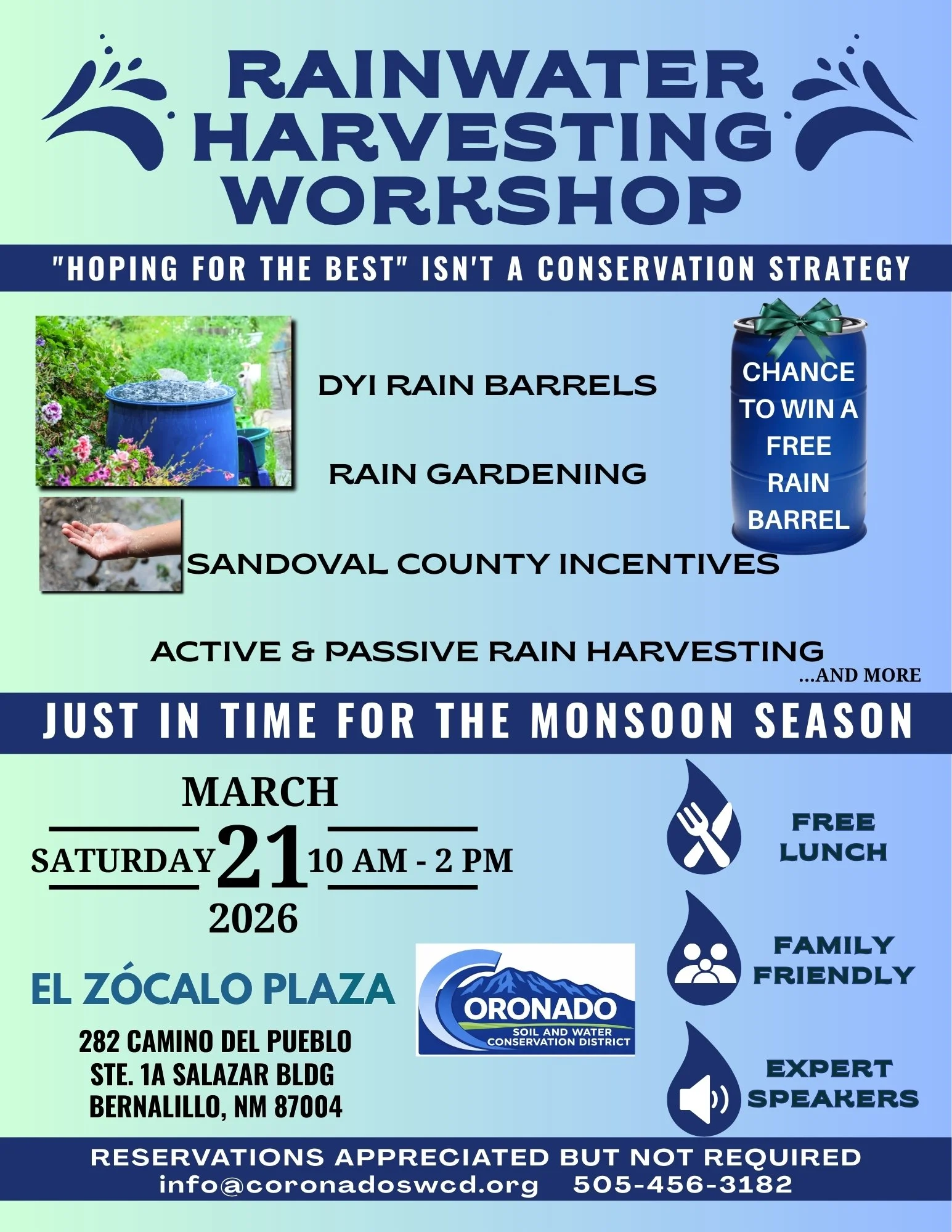 “Hoping for the best” isn’t a conservation strategy. Join us for this workshop and learn more about Rain Gardening, Sandoval County Incentives, DIY Rain Barrels, Active/Passive Rain Harvesting, and more, just in time for monsoon season. Free lunch is provided, the event is family friendly and features expert speakers and a chance to win a free rain barrel. Reservations are appreciated but required, hope to see you there.